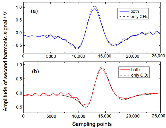 Figure 4. Time-domain 2f signals with the frequency-division multiplexing mode. (a) CH4; (b) CO2.