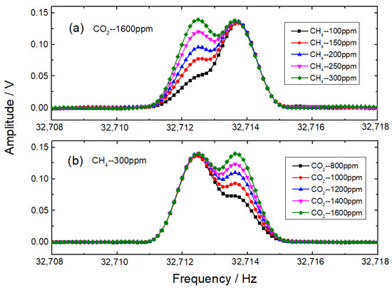 To examine the frequency-domain features of photoacoustic signals, gas mixtures of different concentrations were injected into the photoacoustic cell alternately, with a flow rate of 50 mL/min. For the first group of gas mixtures, the CO2 mole fraction was fixed at 1600 ppm, while CH4 mole fractions ranged from 100 ppm to 300 ppm with a step of 50 ppm. For the second group of gas mixtures, the CH4 mole fraction was fixed at 300 ppm, while CO2 mole fractions ranged from 800 to 1600 ppm with a step of 200 ppm. Modulation frequencies of 16,356.18 Hz for CH4 detection and 16,356.78 Hz for CO2 detection were selected, and sawtooth ramp signals were replaced with bias signals. A real-time frequency analyzer was utilized to process raw photoacoustic signals of different gas mixtures with a sampling time of 8 s. The frequency-domain 2f signals were 10 times averaged, and the frequency-domain resolution was 0.125 Hz. Figure 5 demonstrates the experimental results of different gas mixtures. The frequency-domain 2f signals of CH4 and CO2 mutually overlap, and gas concentrations cannot be directly retrieved from the spectra. Since the experimental signals can be treated as the superposition of the frequency-domain 2f signals of CH4 and CO2, multiple linear regressions can be employed to eliminate interferences.