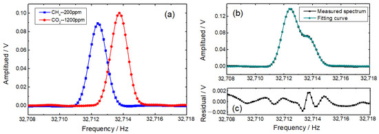 Standard gas samples of 200 ppm CH4 and 1200 ppm CO2 were injected into the photoacoustic cell successively, with a flow rate of 50 mL/min. As depicted in Figure 6a, the frequency-domain 2f signals of CH4 and CO2 are measured individually and are utilized as the basics in the application of multiple linear regressions. Figure 6b demonstrates an excellent fitting result of a gas mixture of 300 ppm CH4 and 800 ppm CO2, which is confirmed by the negligible <1.5% difference shown in Figure 6c.