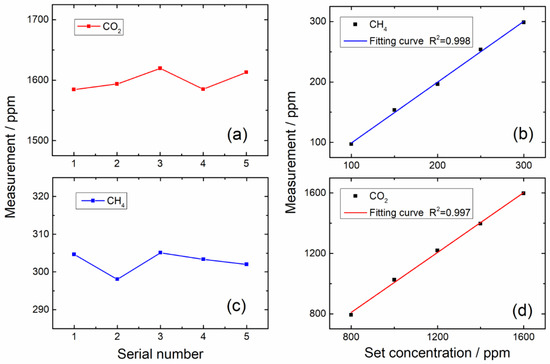 For the first group of gas mixtures, the calculated mole fractions of CO2 are shown in Figure 7a; the deviations of CO2 measurements are −1.3%, −0.5%, 1.6%, 1.3%, and 1.1% respectively. As shown in Figure 7b, there is a good linear relationship between the best-fit mole fractions of CH4, obtained by the multiple linear regression method, and the calibrated gas samples, with a linear correlation coefficient of 0.998. For the second group of gas mixtures, the calculated mole fractions of CH4 are shown in Figure 7c; the deviations of CH4 measurements are 2.3%, −0.9%, 2.5%, 1.7%, and 1.0%, respectively. As shown in Figure 7d, there is a good linear relationship between the best-fit mole fractions of CO2, obtained by the multiple linear regression method, and the calibrated gas samples, with a linear correlation coefficient of 0.997. Based on the results of multiple linear regressions with various gas mixtures, small deviations and good linear relationships for gas detection can be observed under the frequency-division multiplexing mode with a narrow interval of modulation frequencies.