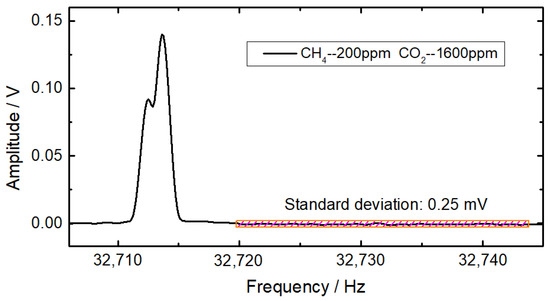 To evaluate the detection limits of CH4 and CO2, the gas mixture of 200 ppm CH4 and 1600 ppm CO2 was injected into the photoacoustic cell with a flow rate of 50 mL/min, and the profile of the frequency-domain QEPAS signal was averaged over 50 times to enhance the signal-to-noise ratio. The peak values of the frequency-domain 2f signals of CH4 and CO2 were determined with multiple linear regressions. As depicted in Figure 8, the standard deviation of the background is 0.25 mV, which corresponds to the signal-to-noise ratio of 332 for CH4 and 551 for CO2. As a result, the minimum detection limits of CH4 and CO2 are 0.6 ppm and 2.9 ppm, respectively.