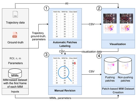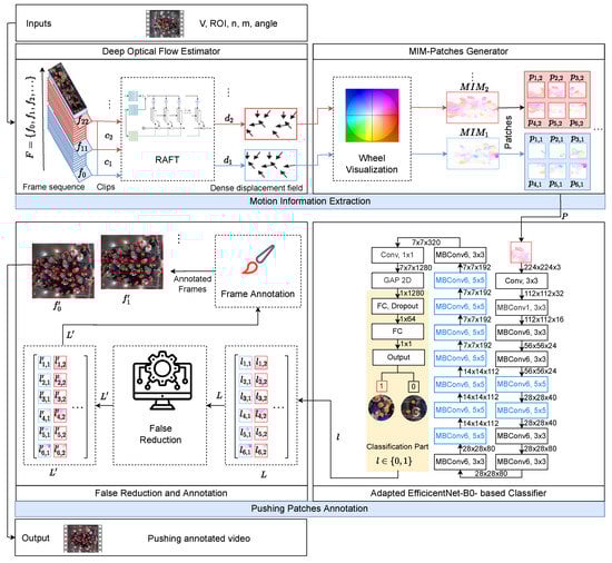 To address the above limitations, we propose a hybrid deep learning and visualization framework for automatically detecting pushing behavior at the patch level in videos. The proposed framework exploits video recordings of crowded entrances captured by a top-view static camera, and comprises two main components: (1) motion information extraction aims to generate motion information maps (MIMs) from the input video. A MIM is an image that contains useful information for pushing behavior representation. This component divides each MIM into several MIM patches, making it easier to see where pedestrians are pushing. For this purpose, recurrent all-pairs field transforms (RAFT) [27] (one of the newest and most promising deep optical flow methods) and the wheel visualization method [28,29] are combined; (2) The pushing patch annotation adapts the EfficientNet-B0-based CNN architecture (the EfficientNet-B0-based CNN [30] is an effective and simple architecture in the EfficientNet family proposed by Google in 2019, achieving the highest accuracy in the ImageNet dataset [31]) to build a robust classifier, which aims to select the relevant features from the MIM patches and label them into pushing and non-pushing categories. We utilized a false reduction algorithm to enhance the classifier’s predictions. Finally, the component outputs pushing the annotated video showed when and where the pushing behaviors appeared.