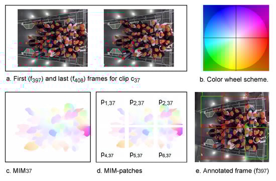 The second module, the MIM patch generator, employs the wheel visualization to infer the motion information from each . Firstly, the wheel visualization calculates the magnitude and the direction of each motion vector at each pixel in . Equations (4) and (5) are used to calculate the motion direction and magnitude, respectively. Then, from the calculated information, the wheel visualization generates , where . In MIM, the color refers to the motion direction and the intensity of the color represents the motion magnitude or speed. Figure 2 shows the color wheel scheme (b) and an example of MIM () (c) that is generated from , whose first and last frames are and , respectively (a). is taken from the experiment 270 [42].