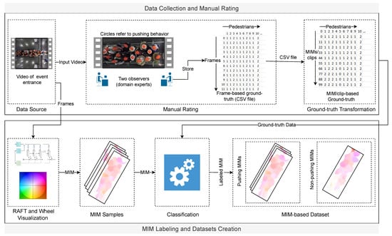 In entrances of large-scale events, pedestrians either follow the social norm of queuing or force some pushing behavior to gain faster access to the events [1]. Pushing behavior in this context is an unfair strategy that some pedestrians use to move quickly and enter an event faster. This behavior involves pushing others and moving forward quickly by using one’s arms, shoulders, elbows, or upper body, as well as using gaps among crowds to overtake and gain faster access [2,3]. Pushing behavior, as opposed to queuing behavior, can increase the density of crowds [4]. Consequently, such behavior may lead to threatening the comfort and safety of pedestrians, resulting in dangerous situations [5]. Thus, understanding pushing behavior, what causes it, and the consequences are crucial, especially when designing and constructing comfortable and safe entrances [1,6]. Conventionally, researchers have attempted to study pushing behavior manually by observing and identifying pushing cases among video recordings of crowded events. For instance, Lügering et al. [3] proposed a rating system on forward motions in crowds to understand when, where, and why pushing behavior appears. The system relies on two trained observers to classify the behaviors of pedestrians over time in a video (the behavior is classified into either pushing or non-pushing categories). In this context, each category includes two gradations: mild and strong for pushing, and falling behind and just walking for non-pushing. For more details on this system, we refer the reader to [3]. To carry out their tasks, the observers analyzed top-view video recordings using pedestrian trajectory data and PeTrack software [7]. However, this manual rating procedure is time-consuming, tedious, and requires a lot of effort by observers, making it hard to identify pushing behavior, specifically when the number of videos and pedestrians in each video increase [3]. Consequently, there is a pressing demand to develop an automatic and reliable framework to identify when and where pushing behavior appears in videos. This article’s main motivation is to help social psychologists and event managers identify pushing behavior in videos. However, automatic pushing behavior detection is highly challenging due to several factors, including diversity in pushing behavior, the high similarity and overlap between pushing and non-pushing behaviors, and the high density of crowds at event entrances.