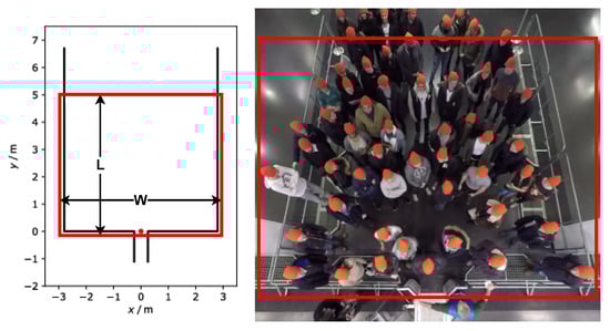 ROI in the entrance. (Left) experimental setup with the red dot indicating the coordinate origin [42], (right) overhead view of an exemplary experiment. The original frame in the right image is from [42]. The entrance gate width is 0.5 m. The rectangle indicates the entrance area (ROI). L: length of ROI in m. According to the experiment, the width of the ROI (w) varies from 1.2 to 5.6 m.