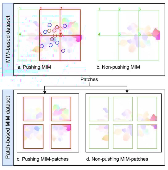 An illustration of two frames (experiment 270 [42]), color wheel scheme [29], MIM, MIM patches, and annotated frame. In sub-figure (e), red boxes refer to pushing patches, while green boxes represent non-pushing patches.