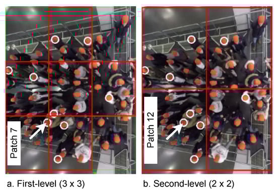 To detect pushing behavior at the patch level, the MIM patch generator divides each into several patches. A user-defined row (n) and column (m) are used to split into patches , where k is the order of the patch in . Afterward, each is resized to a dimension of 224 × 224 × 3, which is the input size of the second component of the framework. For example, in Figure 2c represents an entrance with dimensions 5 × 3.4 m on the ground, and it is divided into 2 × 3 patches as given in Figure 2d. These patches are equal in pixels, whereas the area that is covered by them is not necessarily equal. The far patches from the camera cover a larger viewing area compared to close patches; because the far-away object has fewer pixels per m than a close object [43]. In Figure 2d, the average width and height of the are approximately 1.67 × 1.7 m.