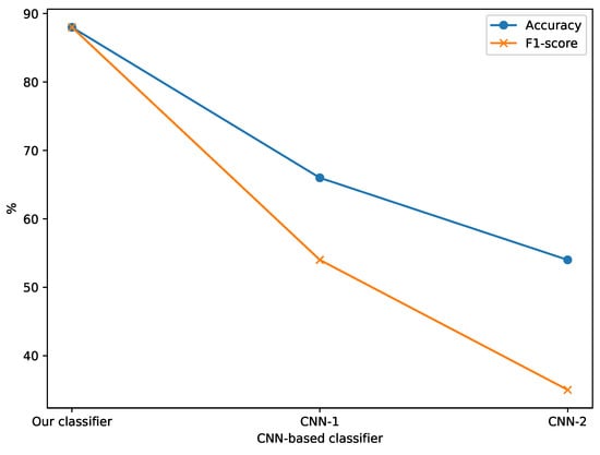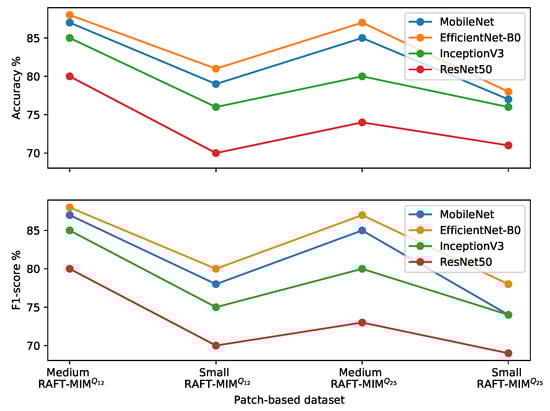 The three classifiers were trained and evaluated based on the patch-based medium RAFT-MIM dataset. As shown in Table 8 and Figure 14, CNN-1 and CNN-2 obtained low accuracy and F1 scores (less than 61%), while our classifier achieved an 88% accuracy and F1 score.