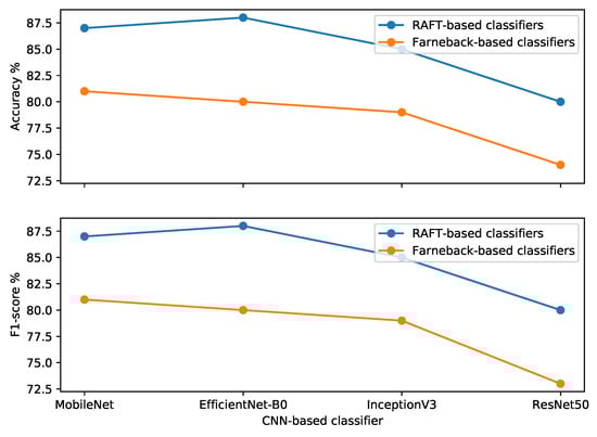 In order to study the impact of RAFT on our classifier, we trained it using the patch-based medium Farnebäck-MIM dataset. Farnebäck is one of the most popular optical flow methods used in human action detection. Firstly, we created patch-based medium training and validation and test sets from the Farnebäck-MIM-based dataset (Table 2). The training and validation sets were used to train the EfficientNet-B0-based classifier (Farnebäck-based classifier), while the test set was used to evaluate the classifier. Finally, we compared the performance of the classifier based on RAFT with the classifier based on Farnebäck. As shown in Table 7 and Figure 13, we find that RAFT improves the classifier performance in all classifiers compared to Farnebäck. In particular, RAFT enhances the EfficientNet-B0-based classifier performance by 8%.