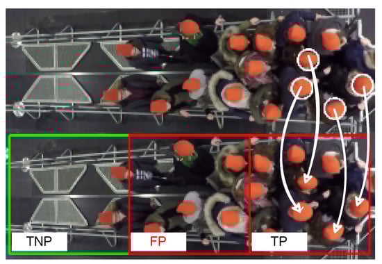 Examples of the visualized classifier predictions with ground truth pushing. The images represent the first frames of in a video, respectively; the video is for experiment 110 [42]. Red boxes: pushing patches. Green boxes: non-pushing patches. Blue circles: ground truth pushing. FNP: false non-pushing. TP: true pushing.