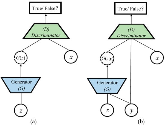 GAN and cGAN structure. (a) Standard GAN network model; (b) conditional GAN network model.