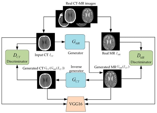 where and are the real CT and MR images; and represent the probability of the MR and CT images coming from real data. and represent the probability of those coming from the generated one.