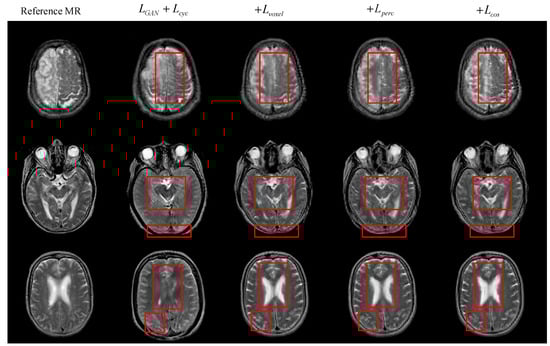 Besides the quantitative analysis of the evaluation indicators above, we can obtain more image details by direct observation of the generated MR images. Figure 5 below shows the visualization results of the generated MR images under different objective functions. From the red rectangle in Figure 5, we can observe that there are differences in complex structure and detailed texture features between different images. Some generated MR images are incomplete in structure and have obvious structural elements missing from real MR images. Other generated MR images have low structural similarity, and many internal texture trends are not displayed. There are also some generated MR images that have insufficient advanced semantic extraction, in which detailed texture features are not obvious. In contrast, each loss item has a certain utility, and the objective function that integrates all the loss items can significantly improve the quality of the generated MR images.