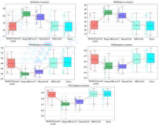 To intuitively reflect the performance indicators, we also describe the indicators in the form of box diagrams. As in Figure 6, the dot on the left of the box diagram represents the distribution of each generated MR image. The green triangle in the box represents the average value of all generated images in various evaluation indicators. The red dotted line connection can clearly compare each model under different evaluation indicators. Figure 7 indicates that the method proposed in this paper is superior to other models in performance. The circles next to the box plots represent a single image slice from the test dataset. The top and bottom box limits were calculated from and. The green triangles and the horizontal lines denote the average and the median. The range of the box plot whiskers is given by . Any data point that falls outside of this range is typically considered an outlier and is indicated by a red cross. The averages displayed in Table 4 indicate that our proposed method outperformed the other methods for all measures, with the lowest MAE and RMSE and the highest PSNR, SSIM, and PCC, thus further verifying the utility of our architecture.