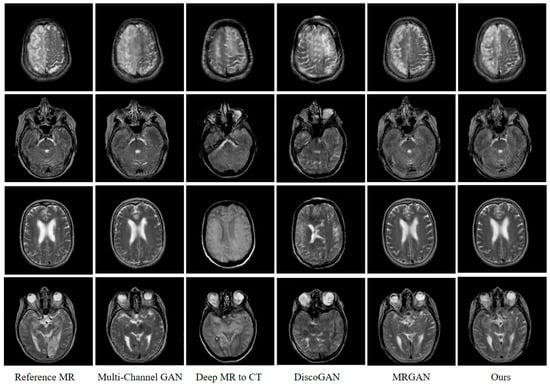 Moreover, the superiority of the algorithm proposed in this paper can also be verified through the human visual mechanism. Figure 7 shows the test results of different randomly selected GAN models from the test set. It can be seen that the generated MR image based on our method can better reflect the detailed texture information of the imaged object with less noise. This shows the multi-conditional constraint GAN model has stronger image construction capabilities, which can better reflect the continuity, smoothness, and semantics of imaging features in image generation. As for the main reason: on the one hand, the reversibility of the cGAN model is fully considered in this paper. The CT image generated by the inverse generator reversely constrains the feature correspondence between the generated MR image and the input CT image. On the other hand, the representation of image semantic information by deep CNN, as well as the characteristics of the modal attributes of the generated and real MR image, is fully considered. Based on this, we construct an objective optimization function including the voxel error, perception error, and cosine error between the generated and real MR image. It is more effective to drive the model to generate MR images with clear detailed texture features and a high peak signal-to-noise ratio.