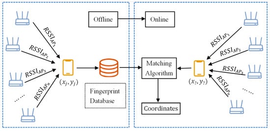 Neural network and deep-learning technologies are also applied in Wi-Fi fingerprint positioning [21,22], but regardless of the system or algorithm, the Wi-Fi fingerprint method always follows a general process consisting of offline and online phases, as shown in Figure 1.
