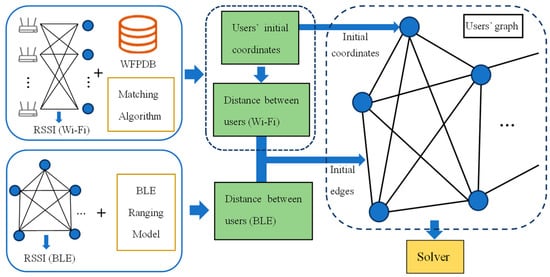 We define the users as nodes of the graph and obtain their initial positioning coordinates by the construction of an offline Wi-Fi fingerprint database and online fingerprint matching. Users receive BLE RSSIs from other users’ devices and input them to the BLE ranging model to obtain physical distances to other users. We define the error function and regard it as the edges between pairs of nodes. The total error function is constructed by all edges and grows in size with the number of users. The optimal solution of the total error function is obtained by the solver, i.e., the LM algorithm and the drifting solution introduced in Section 3.3.