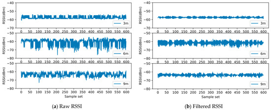 Table 1 presents the comparison of the SD of RSSIs collected at 3, 6, and 9 m before and after filtering. The SD can be reduced by nearly 50% after filtering.