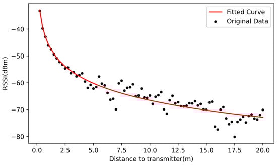 This paper uses the simplified BLE ranging model (Equation (4)) and estimates the values of and by the filtered RSSI at different distances (0.25 m interval) and least-square curve fitting, as shown in Figure 5.
