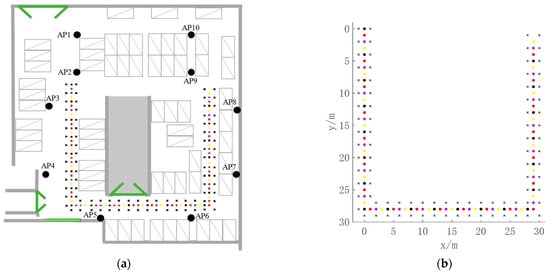 Our experiments used the underground parking lot of North China Electric Power University as a testbed, where the Wi-Fi fingerprint database was constructed. The testbed was 58 m long and 42 m wide, and Wi-Fi APs were installed on the wall 2 m high relative to the parking lot surface. Figure 6a is a plan view of the testbed, where black dots mark the 10 AP locations. Test points (TPs) represent users, and RPs and TPs were set in the middle of the passage. The distance between two adjacent RPs was 2 m, and adjacent TPs were 1 m apart. We deployed 86 RPs and 84 TPs, where an “x” represents an RP and a four-color “o” represents a TP. Figure 6b shows the coordinates of RPs and TPs.