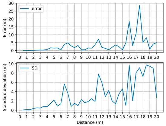 Edges with larger errors in the graph are often formed by two user nodes that are far apart. Giving these edges a reasonable information matrix can weaken the influence of errors. However, when we calculate the information matrix (Equation (11)), we need to determine the value of . We collected the BLE RSSIs every 0.5 m within a range of 20 m from the BLE beacon and input them to the BLE ranging model (Equation (25)) to calculate the error and SD of ranging in each collection point, as shown in Figure 7.