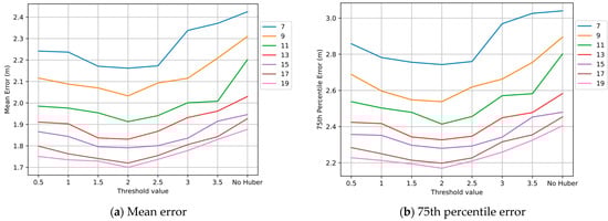 The experimental design of this part was as follows. We obtained the initial coordinates of 84 TPs by KNN matching algorithm and set the Huber kernel function threshold from 0.5 to 3.5. Seven control groups were set up with 7, 9, 11, 13, 15, 17, and 19 nodes per group. Each group randomly selected a corresponding number of points from 84 TPs for optimization and repeated the experiment 1000 times to obtain sufficient data. We also added a comparison experiment without the Huber kernel function in each group. The results in Figure 8 show that the mean positioning error and 75th percentile error were reduced by adjusting the value of threshold from 0.5 to 2. Adjusting the value of threshold from 2 to 3.5, the mean positioning error and 75th percentile error increased. Obviously, setting to 2 is reasonable.