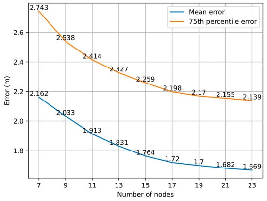 It can be observed that the spacing between the curves decreases as the number of nodes increases, and the curves with 19, 21, and 23 nodes are tightly packed together. The gap between the curves is especially obvious at 2–5 m, indicating that our graph optimization model can significantly improve the positioning accuracy at 2–5 m as the number of nodes increases.