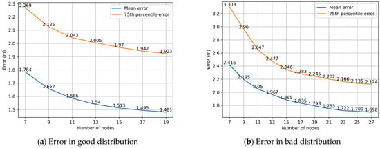 Figure 11a shows the positioning errors under different numbers of nodes in good distribution. It can be found that the mean errors and 75th percentile errors of the good distribution are lower than the random distribution (as shown in Figure 9) under the same number of nodes. The reduction of the mean error is less than 2 cm for every two additional nodes in 15 nodes, and the reduction of 75th percentile error is less than 2 cm for every two additional nodes in 17 nodes. Figure 11b shows the positioning errors under different numbers of nodes in bad distribution. In addition to the fact that the errors are higher than the random distribution, the reduction of the mean error and 75th percentile error is less than 2 cm for every two additional nodes in 23 nodes. In the bad distribution, the positioning accuracy decreases compared with the KNN algorithm when the number of nodes is 7, and the positioning error is only slightly lower than the KNN algorithm when the number of nodes reaches 9, which indicates that the number of nodes in our proposed model needs to be greater than or equal to 9 for better work in our experimental area.