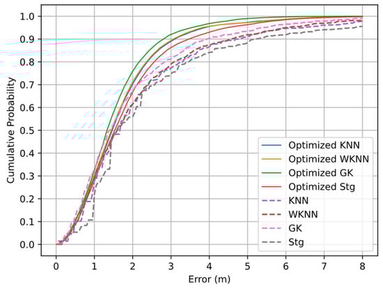 Positioning error CDF curves of Wi-Fi fingerprint-matching algorithms before and after optimization.