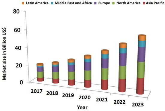 Over the years, smart electrical appliances have become an essential part of our day-to-day activities that offer consumers a fully easy-to-use automated environment and utility savings. In addition, transforming the traditional grids into smart grids (SG) requires efficient analysis and management of energy consumption to balance the demand and supply of energy [1]. Moreover, it benefits the society in terms of efficient energy usage and conservation [2,3]. According to the Electric Power Research Institute (EPRI), the energy department has predicted only a 1% annual growth rate in electricity consumption for the year 2008–2035 [4]. Although the SG installation is considerably expensive, its benefits have proved it to be highly worthy, as more and more countries are keen on expanding their use of SG in various sectors such as smart cities development, smart transportation, and many more [5]. The expansion of the SGs can be correlated to its predicted market size from the year 2017 to 2023, as shown in Figure 1 [6].