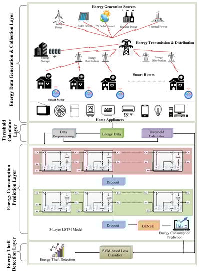 Figure 4 depicts the architecture of the DL-based energy theft detection system referred to as GrAb to ensure the reduction in non-technical energy loss. GrAb consists of four layers: (i) energy data generation and collection layer (EDGCL), (ii) threshold calculator layer (TCL), (iii) energy consumption prediction layer (ECPL), and (iv) energy theft detection layer (ETDL). Each layer is described as follows.