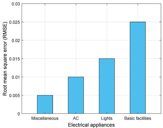 The lower the MAPE and RMSE error values, the better the performance of prediction by the LSTM model. Figure 5 illustrates the RMSE values predicted by the LSTM model for different electrical appliances. The higher the RMSE values, the lower the model’s prediction. From the graph, it is evident that the LSTM has shown an accurate prediction for miscellaneous and AC, as it has a minimum error (0.005 and 0.0010). Contrary, the LSTM model underperforms while predicting basic facilities and light load consumption as it has higher RMSE values, i.e., (0.025 and 0.015). It is important that the LSTM model correctly predicts the load consumption data of the electric appliances that are regularly used and consumes more energy, such as AC, light, fan, and others. This is because such appliances consume more energy and produce high-energy tariff bills for the consumers. Therefore, the forgers try to modify the load consumption data of such appliances to get the minimum tariff bill. Needless to say, the proposed work has accurately predicted the load consumption data of the above-mentioned electric appliances, which results in reduced energy theft in smart grids. Table 4 shows a comparative analysis of the prediction error of MAPE and RMSE for different electrical appliances. The higher the prediction error, the lower the LSTM model’s performance. From Table 4, we can observe that the MAPE prediction error is higher than the RMSE prediction error; this happens because it calculates the absolute average percentage error, but RMSE uses square root to minimize the error. In addition, MAPE is not considered a valuable performance metric when dealing with the time series dataset because MAPE is not differentiable, and its hessian is zero wherever it is defined. So, there might be a need for differentiation when forecasting future energy consumption values. Therefore, RMSE is a reliable performance metric as it is differentiable at any instant of time. The error values show that the miscellaneous has a lower RMSE value and basic facilities have a higher RMSE value (also shown in Figure 5). Incorporating RMSE makes the model highly accurate in load consumption prediction against the other exiting approaches. The last row shows an average load consumption prediction error for both MAPE and RMSE; the value of RMSE is small, indicating that the predicted and actual data are close to each other, which implies that the model has better accuracy. So, we consider the results of the prediction (using the LSTM model) as a basis on which the load classification is employed in the GrAb model.