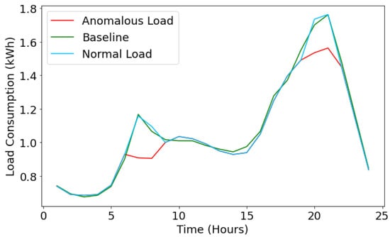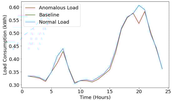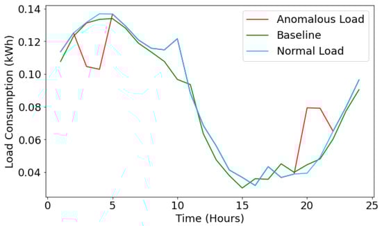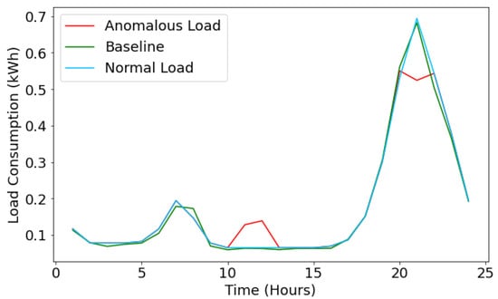 The LSTM model is used to predict the value of load consumption (normal load profile is marked in sky-blue color) and compare it with baseline values (green line), as shown in Figure 9. The graph shows the energy loss prediction for an electric appliance, i.e., light. Furthermore, it depicts the normal energy loss prediction where the baseline (green line) shows the ground truth values and the red line shows the predicted anomalous load profile values of the LSTM model. Figure 9 shows the abnormal behavior in the LSTM-based predicted load profile values; this happens because we have synthetically injected the data (to detect the energy theft), which is not in the distribution of the original load profile data. From the graph shown in Figure 9, it can be observed that at a time (t = 11), the baseline shows 0.064 kWh load consumption; however, the anomalous load shows 0.13 kWh load consumption. Similarly, at a time (t = 21), we can notice the same malicious behavior of the forger. When the actual value fluctuates from the baseline value, there is a high possibility of an energy theft scenario.