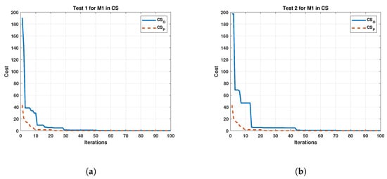 Comparison between the original and the proposed Cuckoo Search in four tests for Motor 1. (a) cost and iterations of the Cuckoo Search in test 1 for Motor 1; (b) cost and iterations of the Cuckoo Search in test 2 for Motor 1; (c) cost and iterations of the Cuckoo Search in test 3 for Motor 1; (d) cost and iterations of the Cuckoo Search in test 4 for Motor 1.