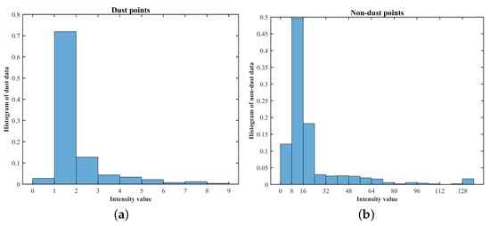 Histogram of VLP-16 LiDAR point clouds when exposed to dust: histogram of dust points as a percentage of total dust points (a) and histogram of non-dust points as a percentage of total non-dust points (b).