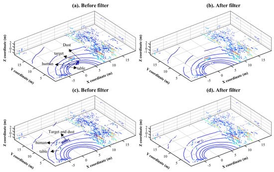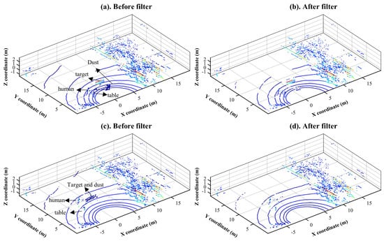 Figure 5a,c present the point-cloud maps without filtering in the first and second test scenarios, respectively, and Figure 5c,d display the maps after applying the LIOR filter in each case. As shown in Figure 5b,d, the LIOR filter removed almost all dust points. Some of the non-dust points having a low-intensity value can also be saved in the second stage (ROR) of the LIOR filter; since non-dust points are dense and the ROR filter can save them, especially if they are not far away from the sensor. However, some low-intensity non-dust points from the environment were also eliminated. The distance from the LiDAR sensor to these eliminated points was approximately more than 15 m in both figures. As mentioned in the theoretical background Section 2.2, this is a drawback of the ROR filter, a part of the LIOR filter, which deletes almost all points that are far away from the sensor. Another limitation of this method is that it is difficult to choose a higher threshold intensity since it is likely to detect more low-intensity points from the environment in the first step and then increase the risk of removing these non-dust points from the environment using the ROR filter in the second step.