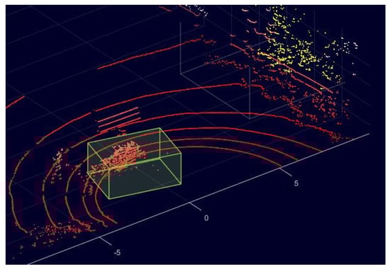 To evaluate our proposed LIOR and LIDROR de-dusting filters, we manually labeled some of the collected data based on prior knowledge about the experimental scene. This work was carried out using the LiDAR labeler app in MATLAB [31], as illustrated in Figure 7, which enables us to draw a cuboid around the dust cloud and label it as dust. In the figure, the points inside the yellow cuboid are labeled as dust. Consequently, dust and non-dust point clouds are labelled 1 and 0, respectively. The metrics used for evaluating the filtering performance are accuracy, precision, recall, and F1-score, defined in Equations (3)–(6).