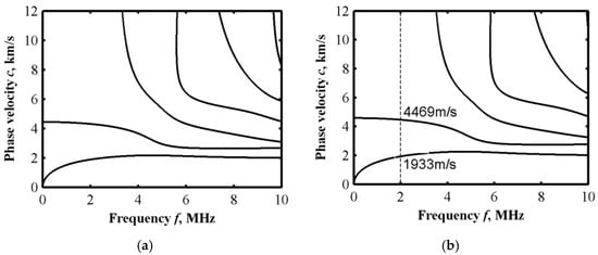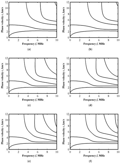 Under different power exponents, the gradient distribution of material parameters in the FGM layer is different, which has a certain influence on the Lamb wave dispersion curves. The dispersion curves of Lamb waves in the sandwich plate under different gradient distributions are calculated, as shown in Figure 5. The cutoff order of the Legendre orthogonal polynomial is also M = 8. Figure 5a–e show Lamb wave dispersion curves in five different sandwich plates, with n = 0.5, 1, 5, 10, 20, respectively. It can be observed that as the power exponent increases, the phase velocity of S0 mode at a low frequency range gradually increases. Meanwhile, the same phenomenon shows up in the higher-order modes. According to Figure 5, when the power index is gradually increased to infinity, the copper content in the FGM layer almost reduces to zero, and the sandwich plates can be regarded as double-layered plates with a top layer of 0.1 mm copper and a bottom layer of 0.3 mm steel. The Lamb wave dispersion curve in the copper–steel double-layered plate calculated by the Legendre orthogonal polynomial method is shown in Figure 5f.
