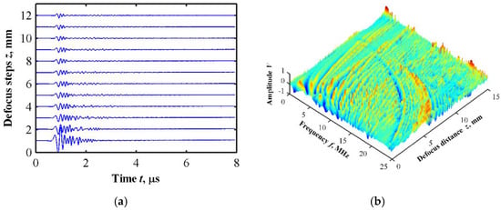 By changing the relative position of the ultrasonic transducer to achieve equal interval defocusing, a defocusing measurement simulation based on an ultrasonic microscopy technique was simulated, which is called V(f, z) analysis [25]. The defocus distance was 15 mm and the step was 0.025 mm. The finite element simulation was performed on each defocus position, and, in total, 600 sets of simulation data were obtained. The Lamb wave dispersion curve can be extracted by performing 2D Fourier transform of the time and space domains, as shown in Figure 9.