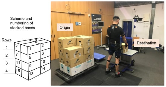 (Right): Picture of test set up. Structure of the pallet of 16 boxes and participant fully instrumented with exoskeleton, EMG sensors and MoCap inertial sensors. Origin: where boxes on pallet are picked up. Destination: table where user places boxes. (Left): Illustration of setup scheme. Numbers represent the order boxes are picked up.