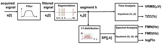 Flow chart of the EMG signals processing. Filtering, segmentation, and parametrization.