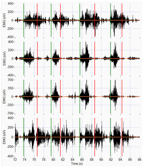 Surface EMG signals acquired simultaneously from four muscles. From top to bottom: erector spinae, gluteus medius, quadriceps femoris, semitendinosus. Time window corresponds to last 4 movements of exercise by subject 4 without exoskeleton. Vertical marks indicate beginning (green) and end (red) of myoelectrical activation, before visual check carried out to catch the boxes.