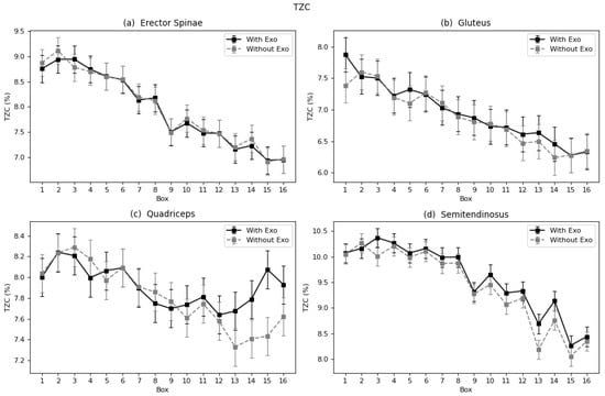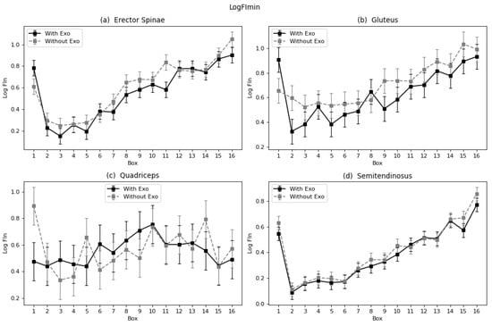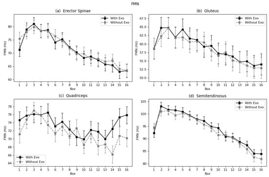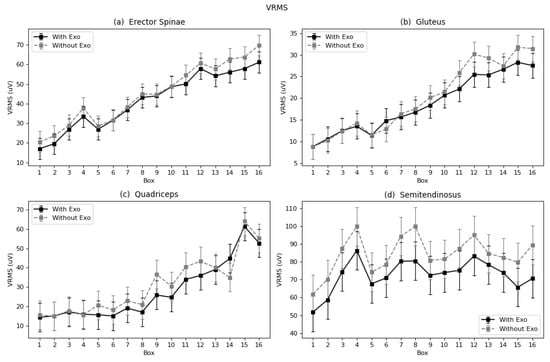 where refers to the condition (with or without exoskeleton), to the position of the box from one to 16, to the box’s weight of 7, 8, or 9 kg, and appears as the random effect. The mixed model was built using the lmer function of the R package lme4 [58]. It was performed for each variable (): VRMS, TZC, FMN, FMD, and and each muscle: lumbar, gluteus, quadriceps, and semitendinosus. was included as a random effect after checking the inter-rater intra-class correlation coefficient [59]. The variance introduced by the was close to the 50% in almost all variables and muscles. A post-hoc analysis was carried out to evaluate the marginal means of the factor , to observe the differences between the conditions with and without exoskeleton. It also was performed to observe these differences by box position, that is the factor . The model adjustment is done using the function interactionMeans of the R phia package [60,61]. This function calculates the adjusted means of the fitted mixed model, plus the standard error of those values, for all the interactions of given factors. The methodology used was the Holm methodology [62]. All calculations were done with R, using the pwr package [63] for the normality test, lme4 [58] for ANOVA, and phia [60] for the post-hoc analysis.