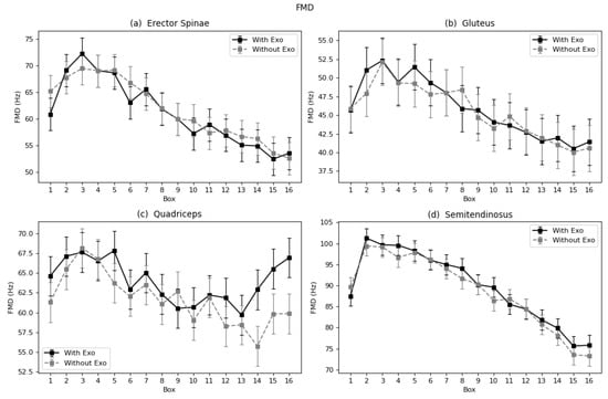 The work of Lotz et al. [40] characterized the impact over fatigue by three aspects. Firstly, as the previous authors, with the evaluation of muscular endurance; also, with the evaluation of the perceived exertion from the participants. Lastly, by the calculation of the minimal median frequency from the frequency domain of the EMG signals. This last approach, was also shared by Godwin et al. [41], who calculated the median frequency to evaluate the fatigue. In both cases, the median frequency presented significant differences between the two conditions. The latest authors, also attributed a reduction of fatigue to the reduction of the torque in the lumbar extension. In addition, Dewi and Komatsuzaki [42] gathered subjective feedback of fatigue from the participants, but the results were varied and there was not agreement.