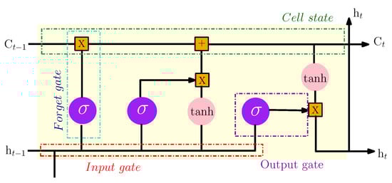 The long short term memory (LSTM) model is a special form of the recurrent neural network (RNN). This model conserves long-term memory by using memory units that can update the previous hidden state. It provides feedback at each neuron. The output of RNN is not only dependent on the current neuron input and weight but also dependent on previous neuron inputs. This functionality makes it possible to understand temporal relationships on a long-term sequence. Its internal memory unit and gate mechanism overcome the exploding and vanishing gradient problems that occur in training traditional RNN. So, the internal structure of the LSTM model includes four important units: input gate, output gate, forget gate and cell status. The three gates are introduced to control the maintenance and the update of information comprised in cell status. Figure 5 shows the structure of an LSTM cell. The computation process can be given in the following as [17]:
