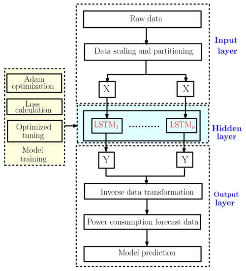 Figure 6 illustrates the forecast strategy framework with the LSTM model. This model can be divided into three big parts [18]: