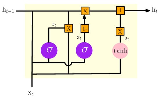 GRU is one of the most popular improved variants of RNN with a special gated recurrent neural network based on optimized LSTM. The GRU internal structure is similar to the internal structure of the LSTM, except that the GRU associates the input gate and the forget gate in the LSTM unit into a single update gate. This model has two gates: one is the update gate, which controls the extent and retains previous information in the current state; the other represents the reset gate which determines whether the previous information and the current state are to be associated [19]. Figure 7 shows the basic design of a GRU unit.