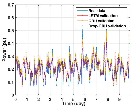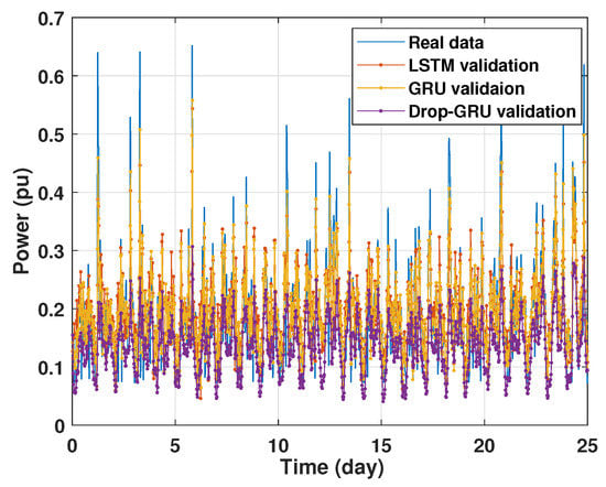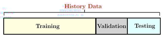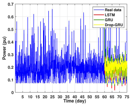 The dataset has been divided into three groups: training, validation and test groups as shown in Figure 8. The training dataset is a dataset of examples used during the learning process and is used to fit the network parameters, such as the weights, and to determine the optimal combinations of variables that will generate a good forecasting model. The validation dataset is a sample of data held back from training the model used to give an estimate of model skill while tuning the model’s hyperparameters in order to avoid the overfitting. Finally, the test set is generally what is used to evaluate competing models. In this work, the training set consists of of the whole dataset. So, we run our model with different ratios and then this percentage is selected because it produces the best accurate predicted values. Indeed, the prediction model has been developed based on the training group. The rest, which represent of the whole dataset, have been allocated as the test set for the model evaluation. Generally, the RNN model has been excused under different ratios based on training and testing data such as 90:10, 80:20, 70:30, 10:90 etc. train/test splits. Then this model selects the best train-to-test for the prediction [23]. The choice of the ratio depends on several factors such as the architecture of the model, type of data and the horizon of prediction. We train the LSTM, the GRU and the Drop-GRU algorithms with 280, 600 and 750 hidden units for the prediction of, respectively, one day, three days and a week. So, the window size of input and output parameters depends on the time scale of the load forecasting. We also use the Adam technique as an optimizer in our study. The learning rate is set to and it decays every 50 epochs. Several Dropouts can also lead to various results, so we choose the appropriate Dropout by the experimental test.