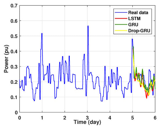 In the first experiment, we present the power consumption prediction of a studied area for one day. Figure 13 illustrates the prediction results of the three methods—LSTM, GRU and Drop-GRU. These results are similar to the true data value.