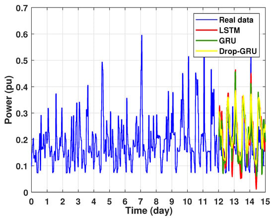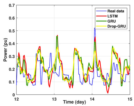 The second experiment represents the power forecasting results over 3 days. Figure 14 shows the results prediction of the proposed algorithms. Figure 15 represents the zoomed version of these prediction results. It seems clear that the prediction curves keep the shape of the actual data curve and the three models, LSTM, GRU and Drop-GRU, are able to forecast the peaks of power consumption.